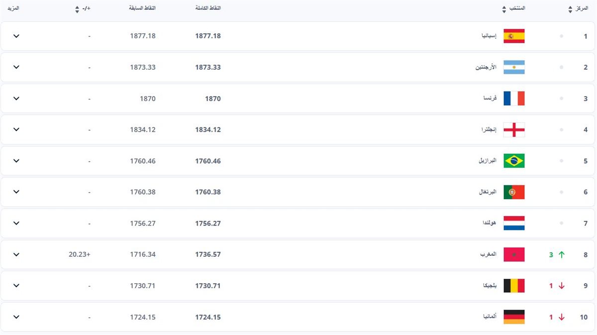 المغرب صعد للمركز الثامن متفوقًا على بلجيكا وألمانيا، بينما المنتخب السنغالي بطل أفريقيا قفز للمركز الـ 12 بعد أن حقق تقدمًا كبيرًا بسبع مراكز.