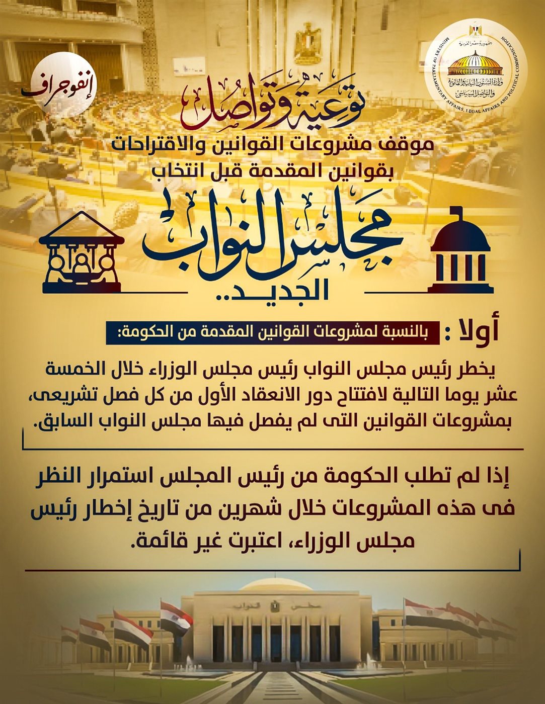 كشفت وزارة الشؤون النيابية والقانونية والتواصل السياسي عن موقف مشروعات القوانين والاقتراحات المقدمة في البرلمان قبل الانتخابات الجديدة لمجلس النواب.