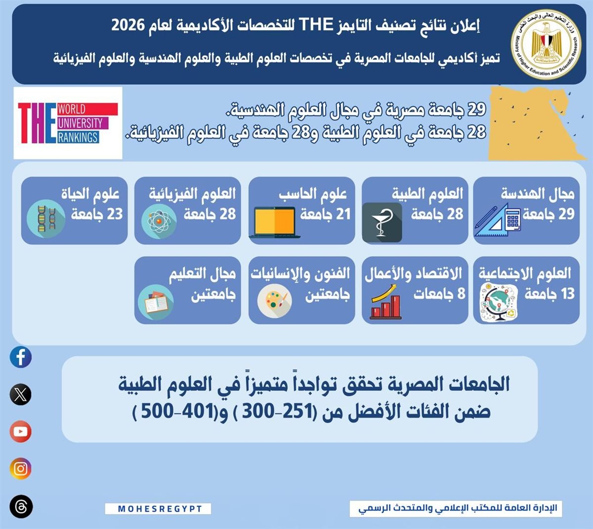 تميز أكاديمي للجامعات المصرية في تخصصات العلوم الطبية والعلوم الهندسية والعلوم الفيزيائية