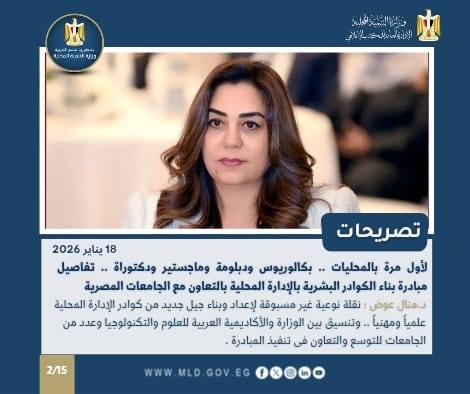 أكدت الدكتورة منال عوض أن الوزارة تعمل على توقيع بروتوكولات تعاون بين مركز التنمية المحلية للتدريب والأكاديمية العربية للعلوم والتكنولوجيا، وعدد من الجامعات الحكومية والخاصة، للتوسع في تنفيذ مبادرة بناء الكوادر البشرية في الإدارة المحلية، والتي أُطلقت مع جامعة بنها.