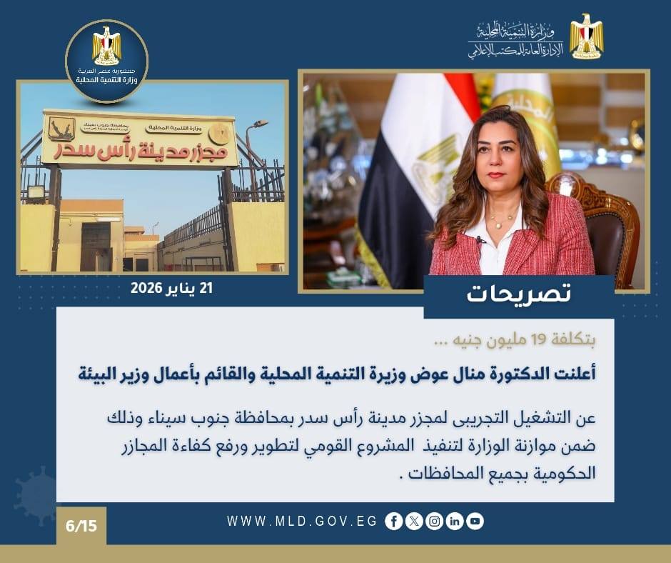 أعلنت الوزيرة عن التشغيل التجريبي لمجزر مدينة رأس سدر بتكلفة 19 مليون جنيه، وذلك ضمن مشروع تطوير المجازر الحكومية.