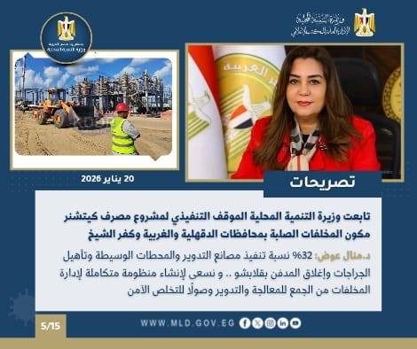 استعرضت وزيرة التنمية المحلية الموقف التنفيذي لمشروع مصرف كيتشنر، الذي تنفذه الوزارة في عدة محافظات بتمويل من البنك الأوروبي، حيث بلغت نسبة تنفيذ مصانع التدوير حوالي 32%، كما شاركت في اجتماع وزاري لمناقشة قضايا التنمية الصناعية.