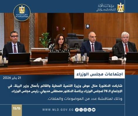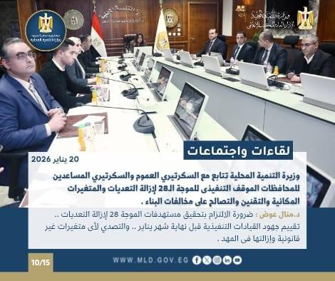 تلقت الدكتورة منال عوض تقريرًا حول جهود إزالة التعديات على أملاك الدولة، حيث نجحت المحافظات في إزالة 5012 مخالفة متنوعة خلال الفترة من 10 إلى 17 يناير 2026، مع متابعة يومية من مركز السيطرة والشبكة الوطنية.