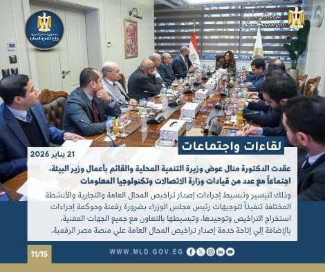 عقدت الدكتورة منال عوض اجتماعًا مع قيادات وزارة الاتصالات لمناقشة خطوات تسهيل إجراءات إصدار تراخيص المحال التجارية، تنفيذاً لتوجيهات رئيس الوزراء بضرورة رقمنة الإجراءات.