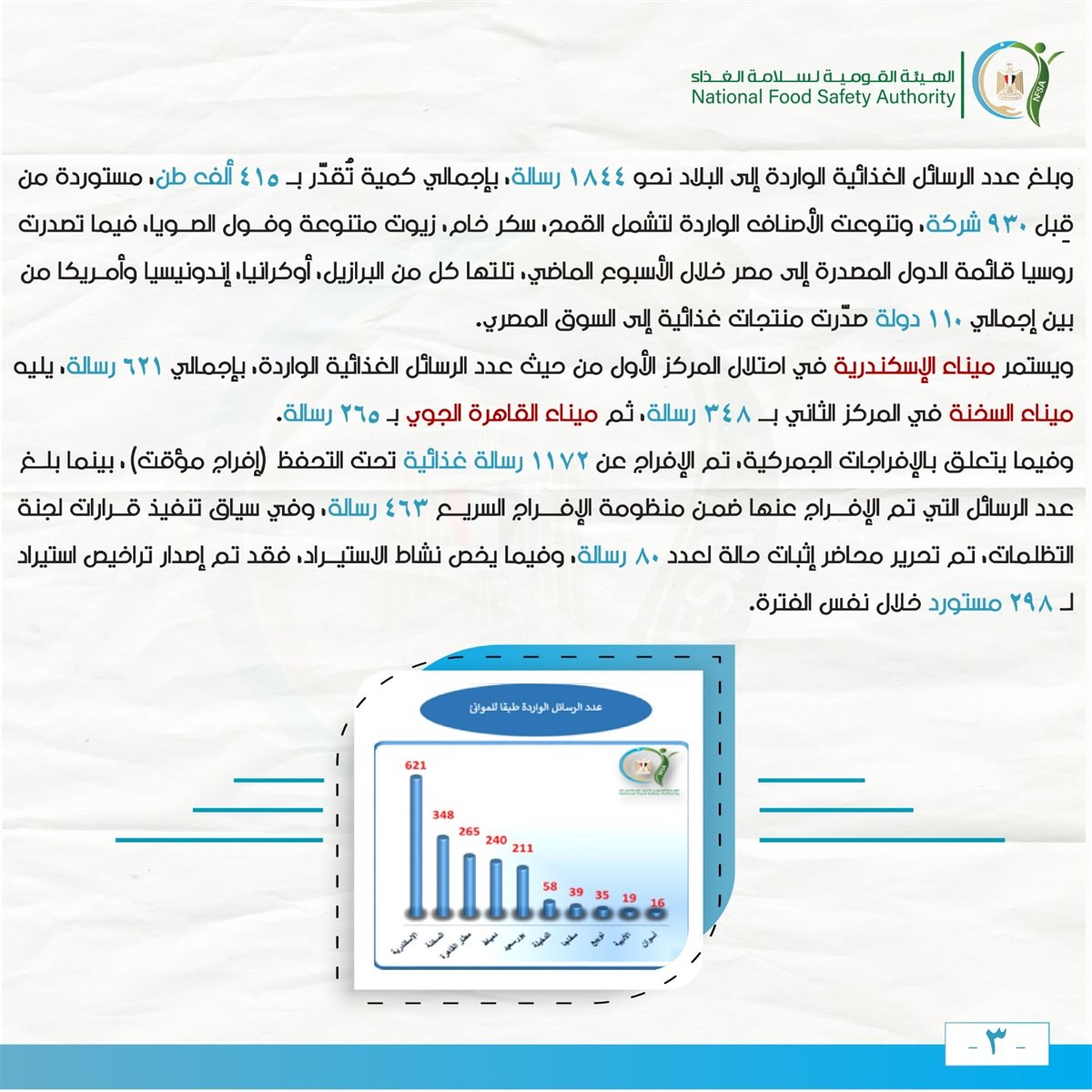 أما بالنسبة للرسائل الغذائية الواردة، فقد بلغت نحو 1844 رسالة بإجمالي 415 ألف طن، مستوردة من 930 شركة، وتصدرت روسيا قائمة الدول المصدرة إلى مصر. ميناء الإسكندرية كان الأكثر استقبالًا للرسائل الغذائية.