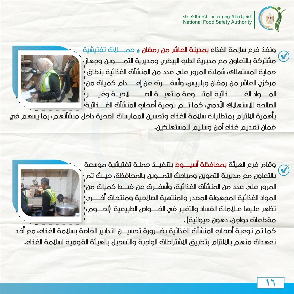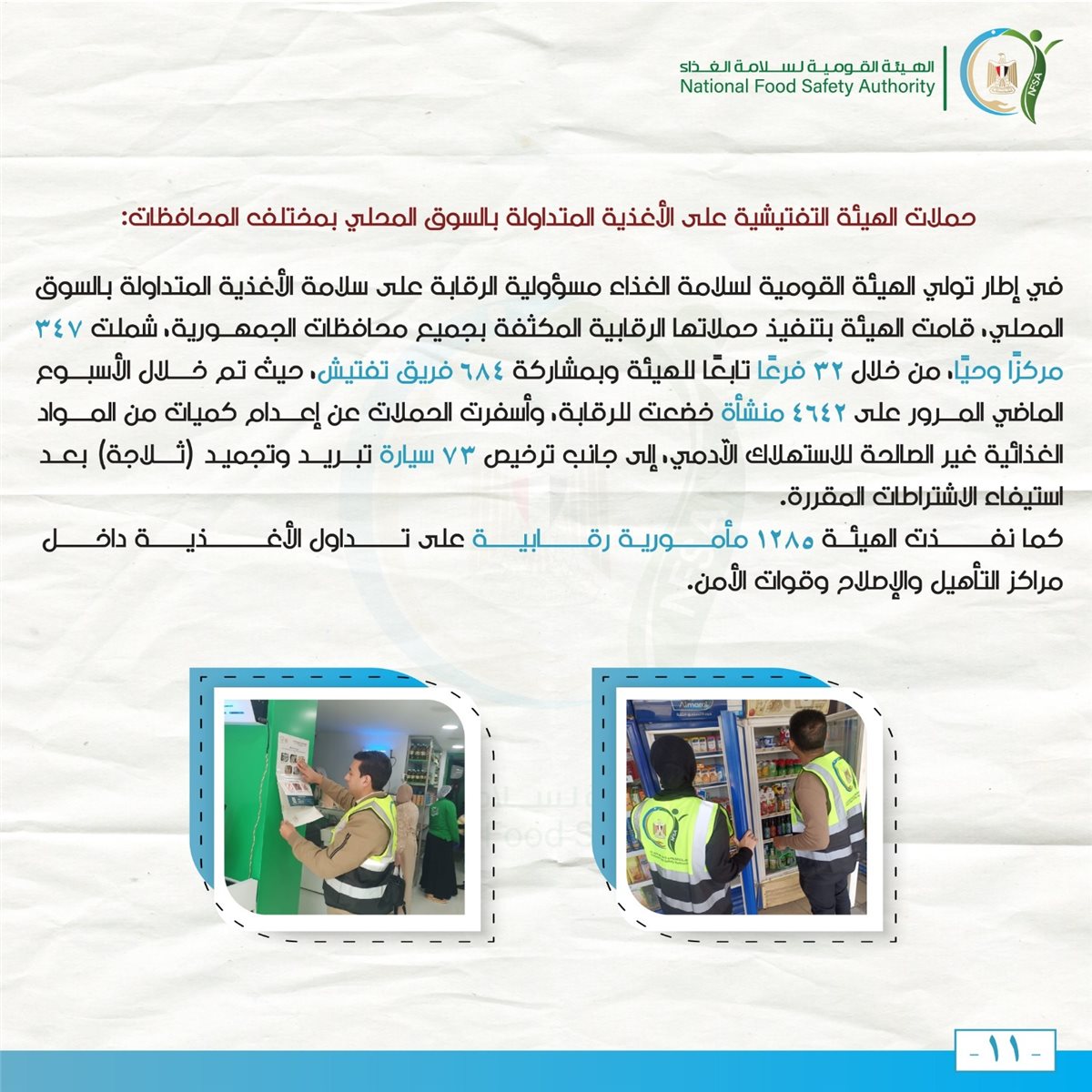 استمرت الهيئة في دعم جهودها لتحسين سلامة الغذاء، من خلال تنفيذ حملات تفتيشية موسعة وتوعية أصحاب المنشآت الغذائية بأهمية الالتزام بالاشتراطات الصحية.