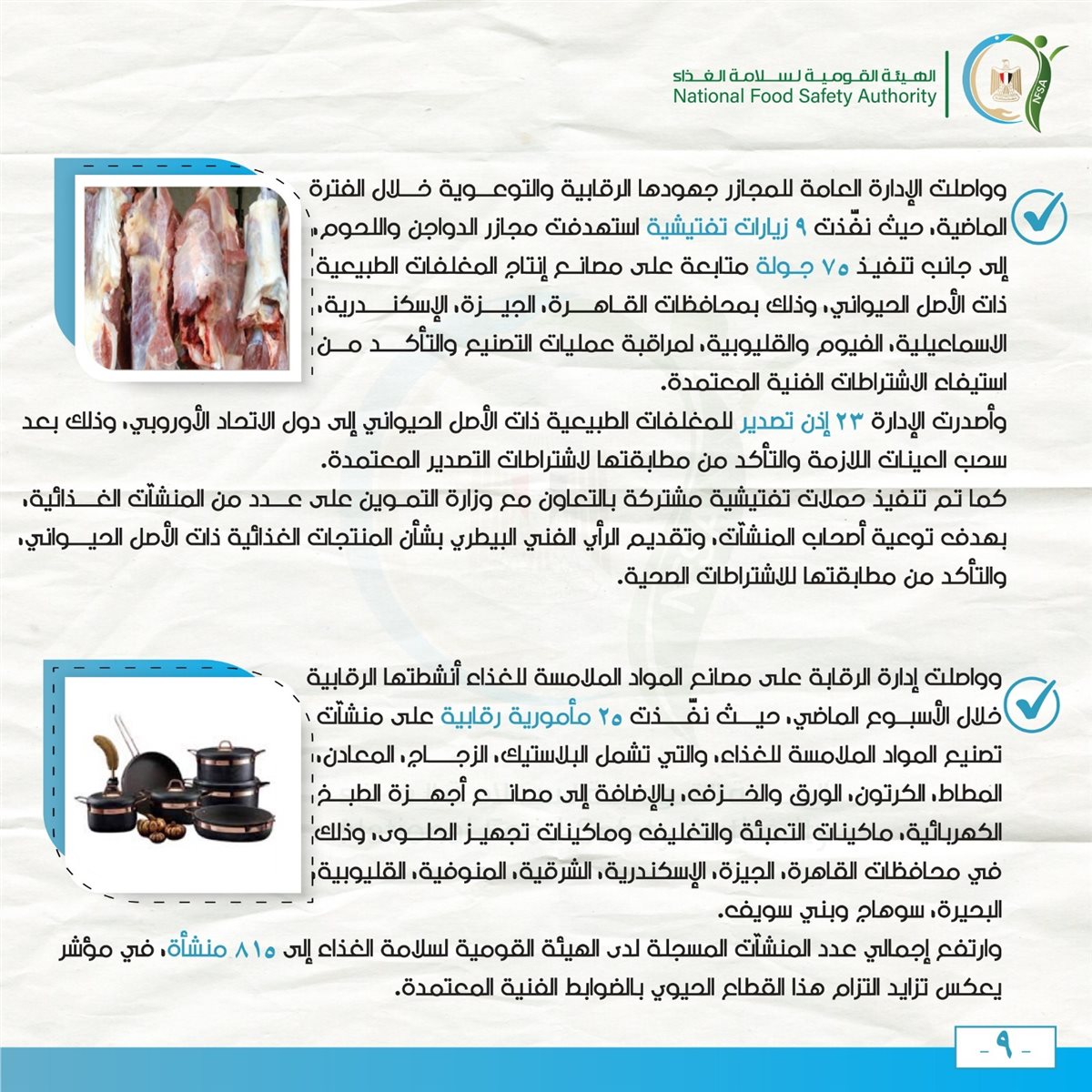 استمرت الهيئة في جهودها الرقابية على المجازر، حيث نفذت 9 زيارات تفتيشية على مجازر الدواجن واللحوم، وأصدرت 23 إذن تصدير للمغلفات الطبيعية ذات الأصل الحيواني.